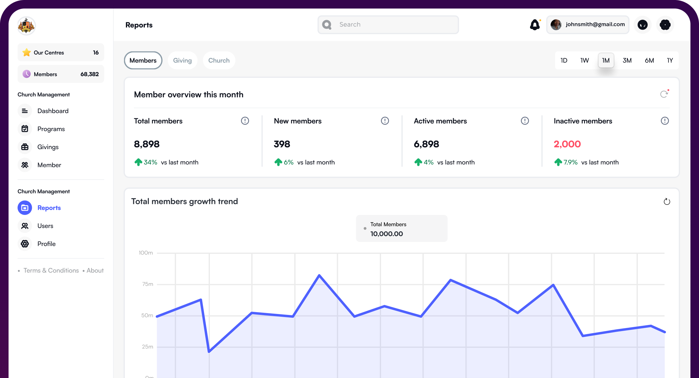 Gain insights into your data to help you understand and grow your church. Leaders can monitor the health of their ministry by combining giving and engagement data into a single view.